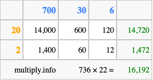 Below is an illustration showing you how to calculate 736 times 22 using the box method, using the instructions above.