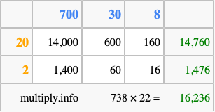 Finally, we add up all the sums we found in step 3 to get our final answer to 738 times 22.