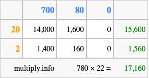 That's all there is to it! As you can see from the box above, the answer to 780 times 22 using the box method is 17,160.