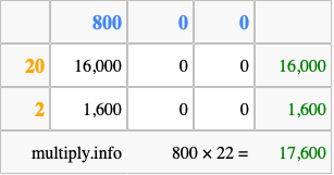 That's all there is to it! As you can see from the box above, the answer to 800 times 22 using the box method is 17,600.