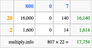 Finally, we add up all the sums we found in step 3 to get our final answer to 807 times 22.