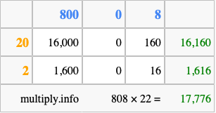 Finally, we add up all the sums we found in step 3 to get our final answer to 808 times 22.