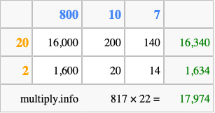 Finally, we add up all the sums we found in step 3 to get our final answer to 817 times 22.
