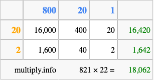 That's all there is to it! As you can see from the box above, the answer to 821 times 22 using the box method is 18,062.