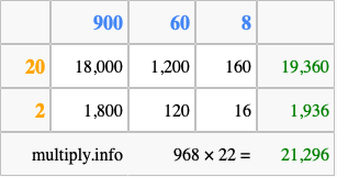 That's all there is to it! As you can see from the box above, the answer to 968 times 22 using the box method is 21,296.