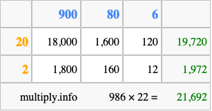 Finally, we add up all the sums we found in step 3 to get our final answer to 986 times 22.