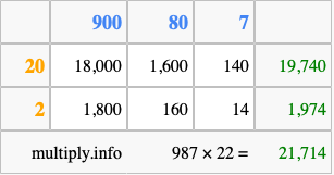 That's all there is to it! As you can see from the box above, the answer to 987 times 22 using the box method is 21,714.