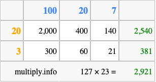 Below is an illustration showing you how to calculate 127 times 23 using the box method, using the instructions above.