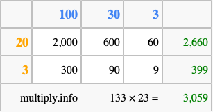 Below is an illustration showing you how to calculate 133 times 23 using the box method, using the instructions above.