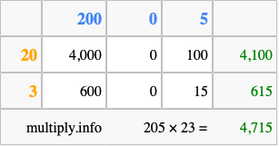 Finally, we add up all the sums we found in step 3 to get our final answer to 205 times 23.