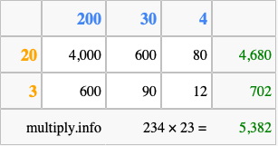 Finally, we add up all the sums we found in step 3 to get our final answer to 234 times 23.