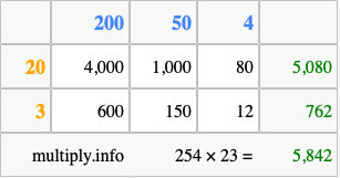 That's all there is to it! As you can see from the box above, the answer to 254 times 23 using the box method is 5,842.