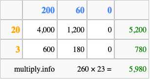 Finally, we add up all the sums we found in step 3 to get our final answer to 260 times 23.