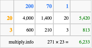 Below is an illustration showing you how to calculate 271 times 23 using the box method, using the instructions above.