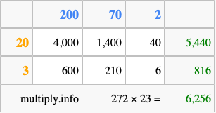 That's all there is to it! As you can see from the box above, the answer to 272 times 23 using the box method is 6,256.