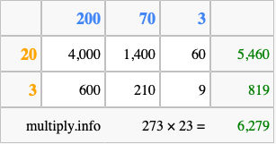 That's all there is to it! As you can see from the box above, the answer to 273 times 23 using the box method is 6,279.