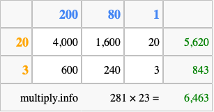 Finally, we add up all the sums we found in step 3 to get our final answer to 281 times 23.