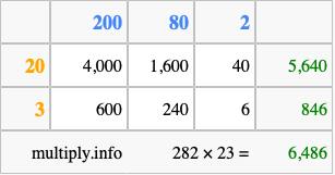 Finally, we add up all the sums we found in step 3 to get our final answer to 282 times 23.