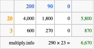 That's all there is to it! As you can see from the box above, the answer to 290 times 23 using the box method is 6,670.