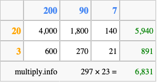That's all there is to it! As you can see from the box above, the answer to 297 times 23 using the box method is 6,831.