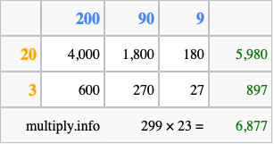 That's all there is to it! As you can see from the box above, the answer to 299 times 23 using the box method is 6,877.
