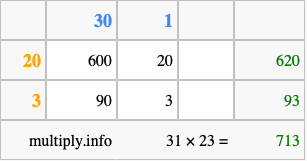 That's all there is to it! As you can see from the box above, the answer to 31 times 23 using the box method is 713.