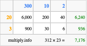 Finally, we add up all the sums we found in step 3 to get our final answer to 312 times 23.