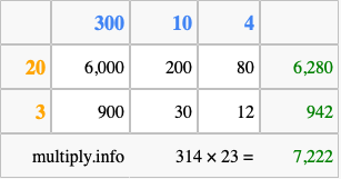 Finally, we add up all the sums we found in step 3 to get our final answer to 314 times 23.