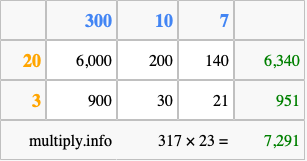 Below is an illustration showing you how to calculate 317 times 23 using the box method, using the instructions above.