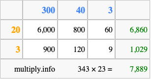 Finally, we add up all the sums we found in step 3 to get our final answer to 343 times 23.