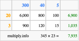 That's all there is to it! As you can see from the box above, the answer to 345 times 23 using the box method is 7,935.