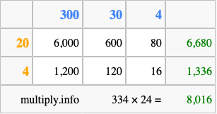 Below is an illustration showing you how to calculate 334 times 24 using the box method, using the instructions above.
