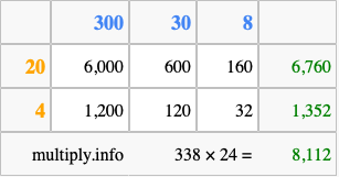 That's all there is to it! As you can see from the box above, the answer to 338 times 24 using the box method is 8,112.
