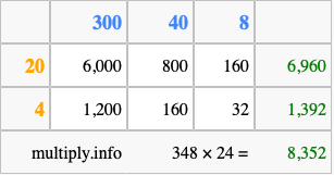 Finally, we add up all the sums we found in step 3 to get our final answer to 348 times 24.