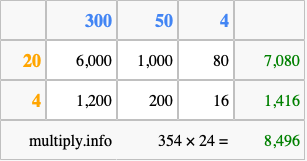 That's all there is to it! As you can see from the box above, the answer to 354 times 24 using the box method is 8,496.