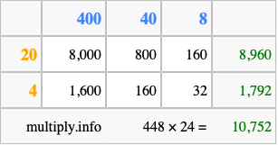 That's all there is to it! As you can see from the box above, the answer to 448 times 24 using the box method is 10,752.