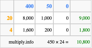Below is an illustration showing you how to calculate 450 times 24 using the box method, using the instructions above.