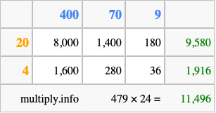 Below is an illustration showing you how to calculate 479 times 24 using the box method, using the instructions above.