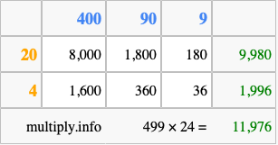That's all there is to it! As you can see from the box above, the answer to 499 times 24 using the box method is 11,976.
