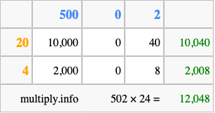 That's all there is to it! As you can see from the box above, the answer to 502 times 24 using the box method is 12,048.
