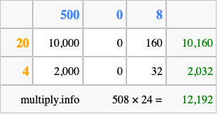 Below is an illustration showing you how to calculate 508 times 24 using the box method, using the instructions above.