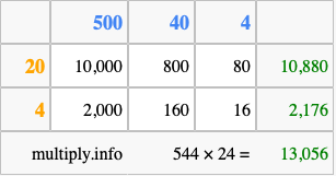 That's all there is to it! As you can see from the box above, the answer to 544 times 24 using the box method is 13,056.