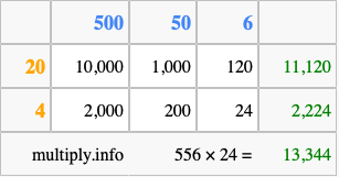 Below is an illustration showing you how to calculate 556 times 24 using the box method, using the instructions above.