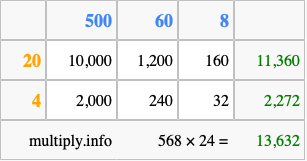 Below is an illustration showing you how to calculate 568 times 24 using the box method, using the instructions above.