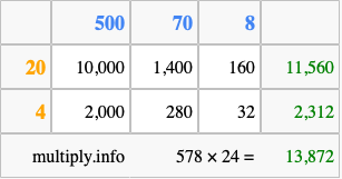 Finally, we add up all the sums we found in step 3 to get our final answer to 578 times 24.