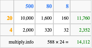 Finally, we add up all the sums we found in step 3 to get our final answer to 588 times 24.