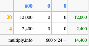 That's all there is to it! As you can see from the box above, the answer to 600 times 24 using the box method is 14,400.