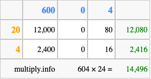 Finally, we add up all the sums we found in step 3 to get our final answer to 604 times 24.
