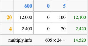 Finally, we add up all the sums we found in step 3 to get our final answer to 605 times 24.