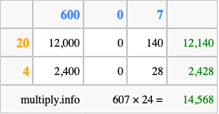 That's all there is to it! As you can see from the box above, the answer to 607 times 24 using the box method is 14,568.